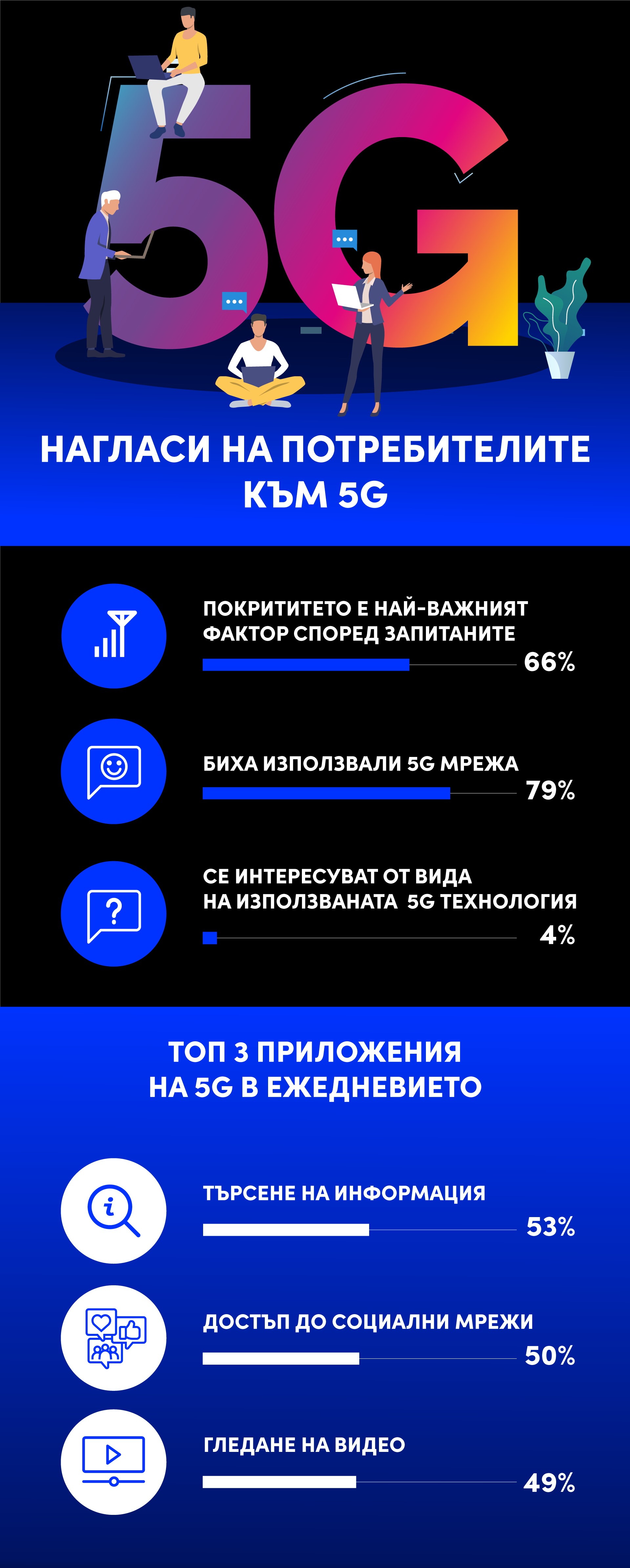 Търсене на актуална информация (53% от запитаните), достъп до социални мрежи (50%) и гледане на видео онлайн (49%) са трите основни дейности, за които анкетираните биха използвали 5G технологията, а най-малък процент от запитаните ще прилагат новото поколение за стриймване и качване на видео съдържание (едва 14% от запитаните). Повече информация за проведеното проучване може да намерите тук.