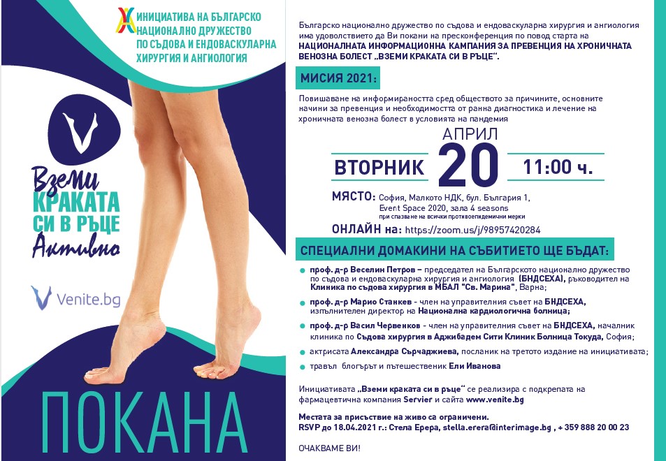 От името на Българското национално дружество по съдова и ендоваскуларна хирургия и ангиология имаме удоволствието да Ви поканим на пресконференция по повод старта на Национална информационна кампания за превенция на хроничната венозна болест „Вземи краката си в ръце“.