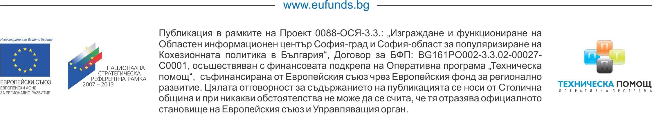 Областен информационен център – София (Договор за безвъзмездна финансова помощ №BG161PO002-3.3.02-0027-C0001, изпълняван от СО) е част от мрежата от 28 информационни центъра за популяризиране на Кохезионната политика на Европейския съюз в България, създадени с финансовата подкрепа на Оперативна програма „Техническа помощ“, съфинансирана от Европейския съюз чрез Европейския фонд за регионално развитие.