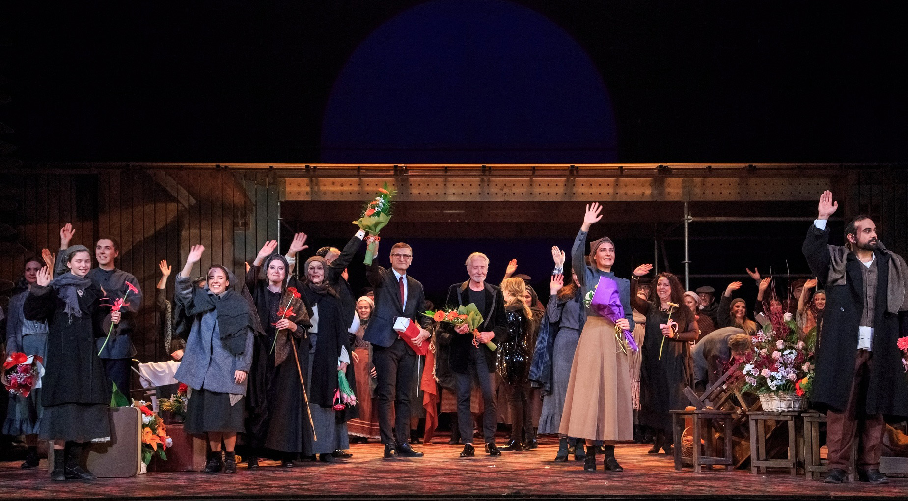 На финала диригентът-постановчик Юли Дамянов излезе на сцената с традиционна еврейска шапка. "За прекрасната работна атмосфера и урока по професионализъм благодарим от сърце на големия сръбски режисьор Небойша Брадич, както и на целия постановъчен екип" - заяви от сцената директорът на Музикалния театър Марияна Арсенова и пожела на добър час на спектакъла.