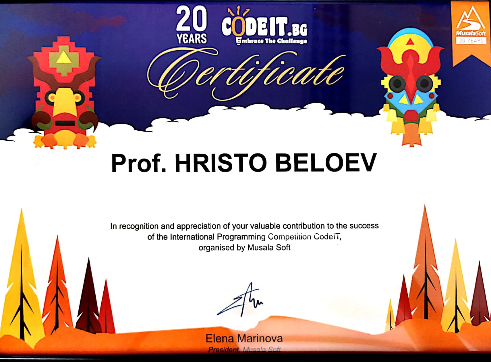 Днес, 13 юли (понеделник), 2020 г., ректорът на Русенския университет чл.-кор. проф. д.т.н. Христо Белоев получи благодарствено писмо от президента на „Мусала Софт“, г-жа Елена Маринова, в израз на дълбока благодарност за дългогодишното партньорство между Русенски университет „Ангел Кънчев“ и международния конкурс по програмиране CodeIT, организиран от софтуерна компания Мусала Софт.