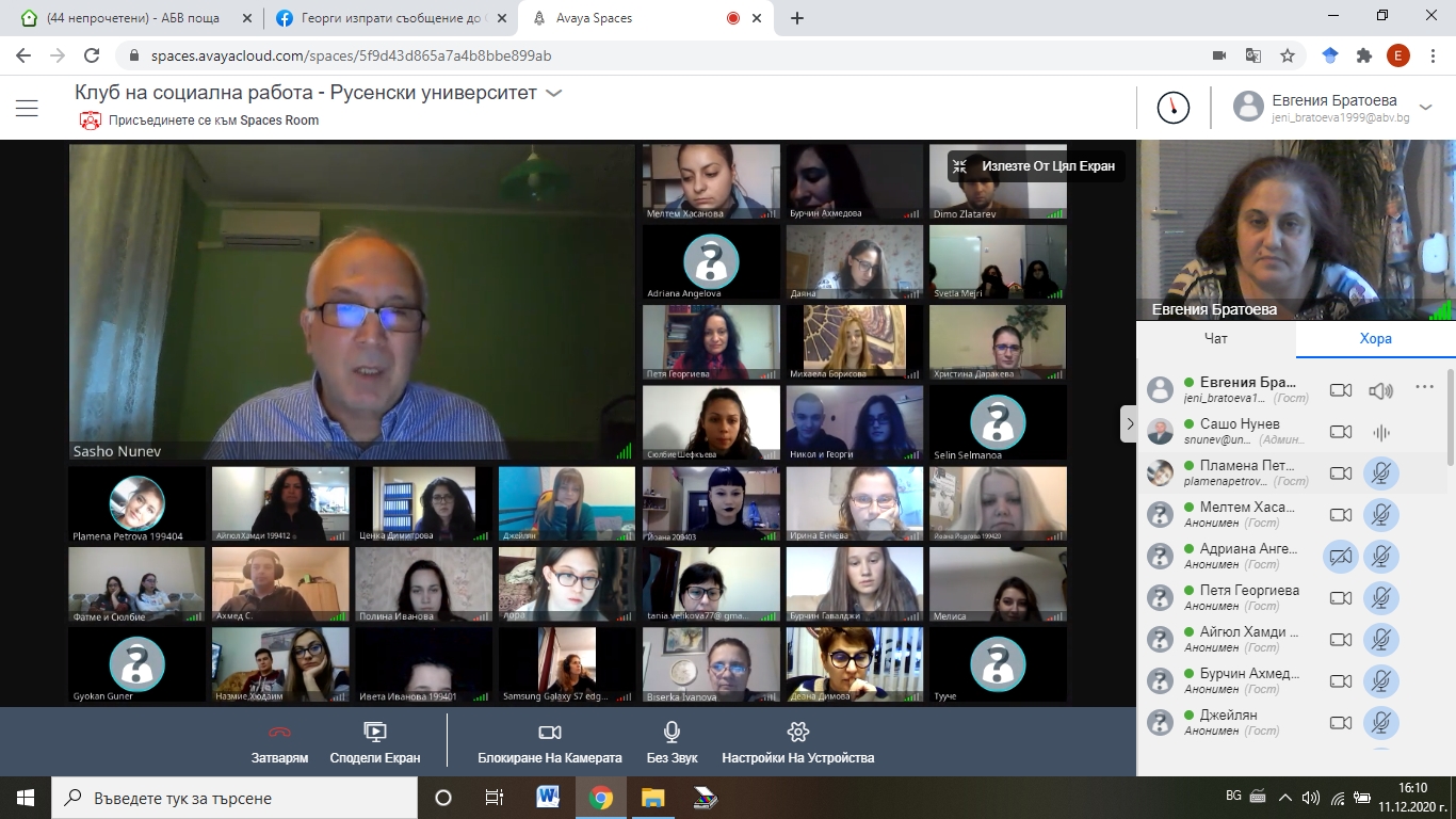 В началото на събитието проф. дн Сашо Нунев приветства участниците, прочете благодарствен адрес на студент и подчерта, че постигнатите много добри резултати от проведената във виртуална среда учебна практика по социална работа в отделните курсове на специалността се дължат на създадената между двете страни много добра организация и дългогодишно партньорство.