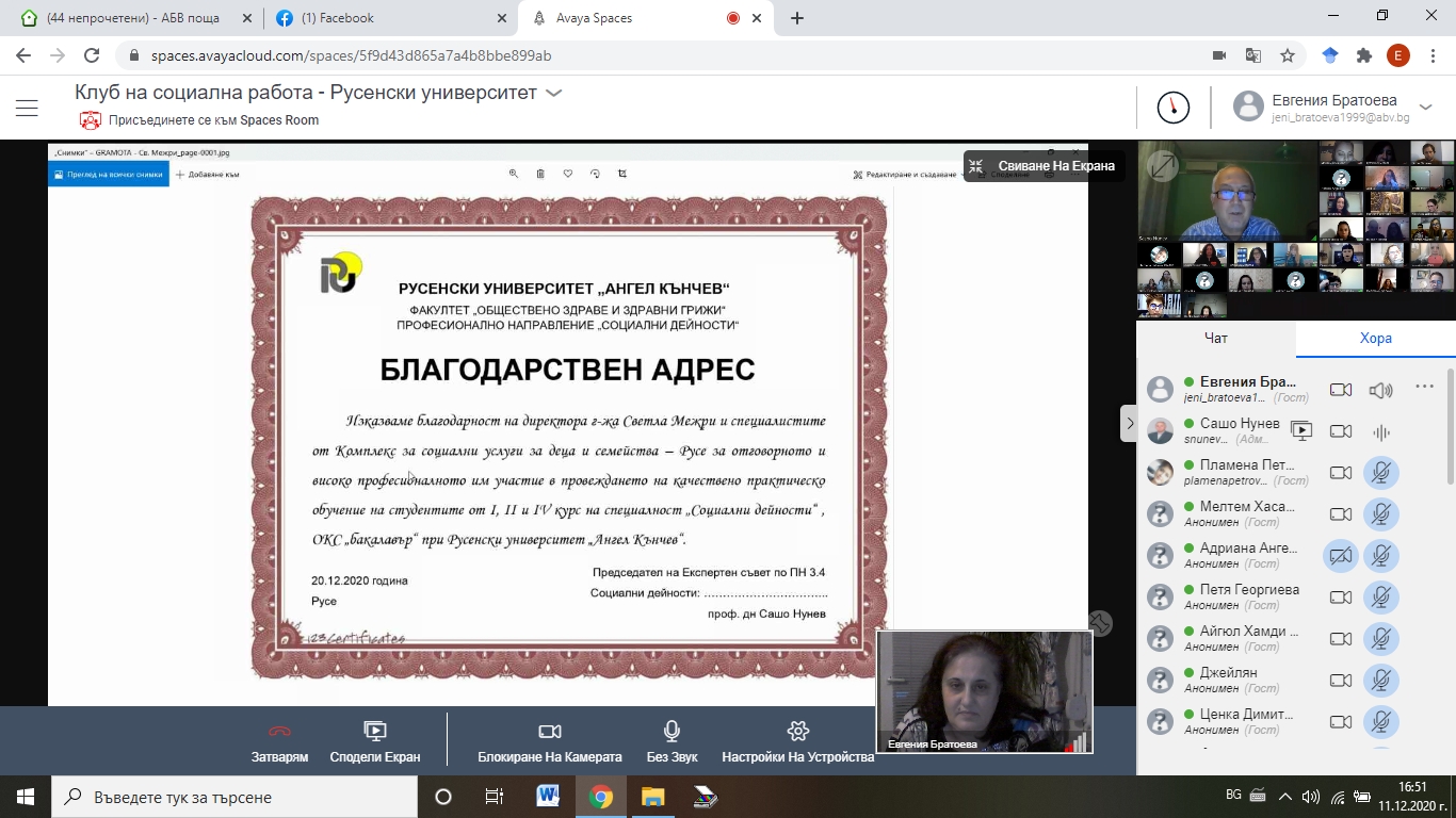 В заключителната част на срещата проф. дн Сашо Нунев сподели във виртуалната зала и прочете благодарствени адреси за управители и социални работници и екипи от специалисти в социални услуги, директора на Дирекция „Социално подпомагане“ – Русе г-жа Детелина Матева и социални работници от районни отдели „Социална закрила“ към Дирекцията. Той отбеляза пред всички участници, че отличното партньорство ще продължи да се развива и усъвършенства през предстоящия семестър и следващите учебни години в интерес на добрата практическа подготовка на студентите и повишаване на обществения престиж на професията и образованието по социална работа.