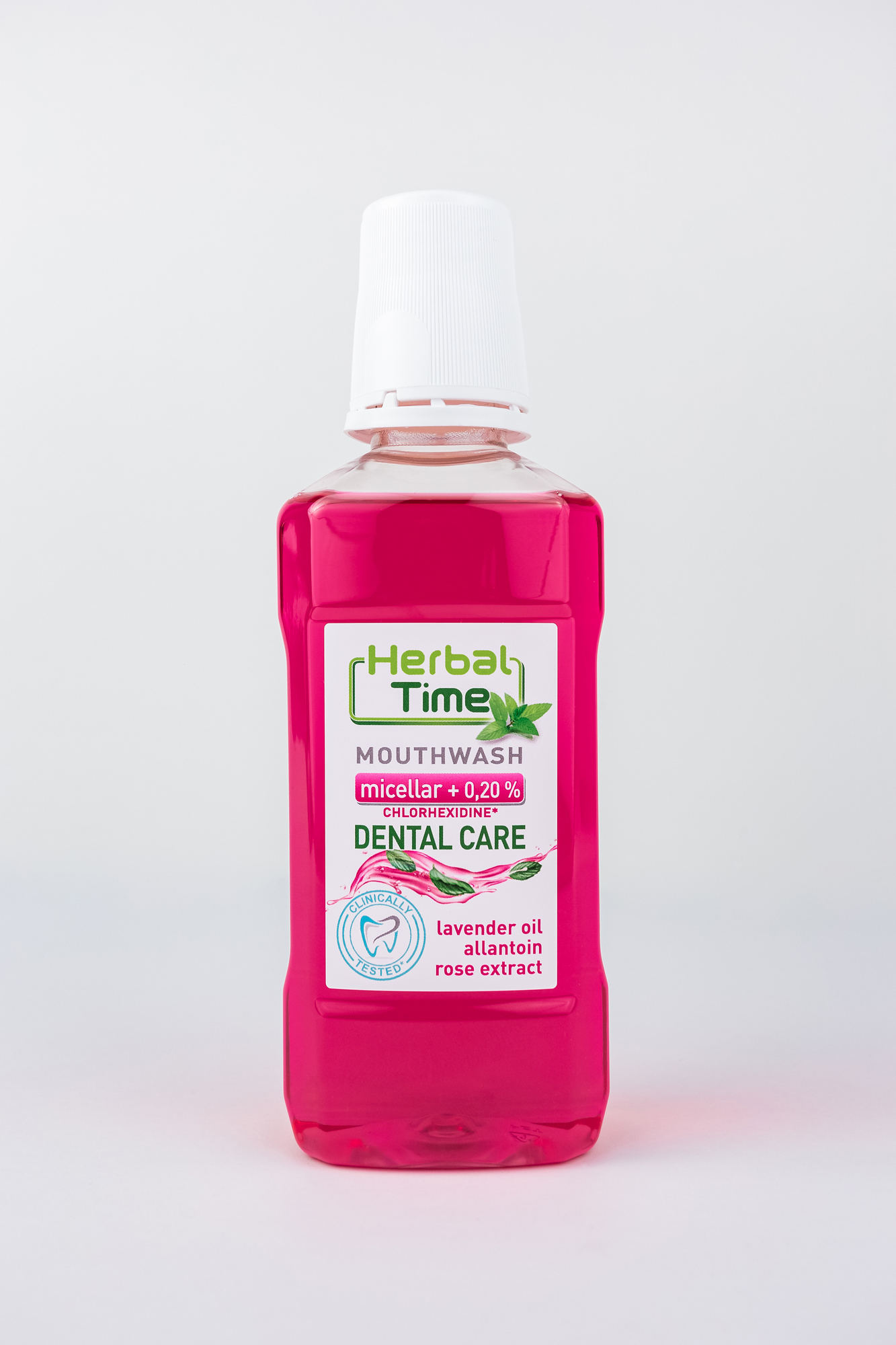 Хлорхексидиндиглюконат – осигурява до 12 часа зашита от плака и бактерии. Златен стандарт в стоматологичното лечение. Тя е подходяща за хора със зъбни операции, които не могат да си мият зъбите. При всекидневна употреба може да се разрежда до 1/2 и 1/3. Лавандуловото масло, което е част от съставките, укрепва венците, заздравява лигавицата и освежава дъха. Притежава противовъзпалително, антисептично, кръвоспиращо, омекчаващо и обезболяващо действие. Алантоинът, който помага за защита на оралната лигавица и притежава регенериращи свойства. Екстрактът от роза има мощно противовъзпалително действие. Отделно нежният аромат на Rosa Damascena приятно тонизира и освежава дъха. Иновативната мицеларна технология със специален пенител на BASF ограничава натрупването на плака, предотвратява образуването на кариеси, поддържа венците здрави и стегнати, запазва естествената белота на зъбите, освежава дъха и спомага в борбата със зъбната плака. И тя съдържа също натурални подсладители и хранителни консерванти.