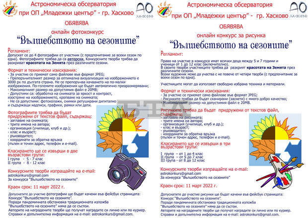 За единайсета поредна година Астрономическата обсерватория при "Младежки център" - Хасково, обявява два онлайн конкурса за ученици под общото название "Вълшебството на сезоните", посветени на настъпването на астрономическата пролет, съобщиха от общината. Конкурсите са за фотография и за рисунка, разкриваща красотата на земята през различните сезони.