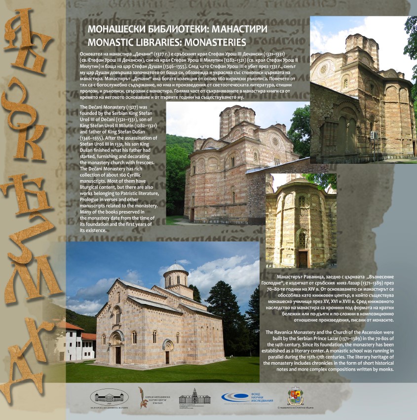 Първите табла са посветени на няколко Атонски манастира, които в XIV в. са имали водещо значение за превеждането и създаването на книжнина. Те са Хилендарският манастир, българският светогорски манастир „Св. Георги“ (Зографски манастир) и манастирите „Св. Панталеймон“ и „Св. Павел“. На следващото табло представяме една от хипотезите за местоположението на манастира, основан от византийския монах и един от най-големите духовни учители Григорий Синаит. Той става средище за създаване и превод на множество различни ръкописи. След смъртта на Григорий Синаит неговият ученик Теодосий Търновски основава Кефаларевския манастир, чиято история е описана на същото табло. Следват Драгалевският манастир „Успение Богородично“ и Рилският манастир „Св. Иван Рилски“, поместени заедно, Бачковският манастир и манастирите „Дечани“ и „Раваница“, също са показани в общо табло. Последните четири табла от изложбата са посветени на руските манастири, известни със своята богата книжовна дейност в периода XIV–XVI в. Те са Чудов манастир, Свято-Троицка Сергиева лавра, Кирило-Белозерски манастир и Соловецки манастир.
