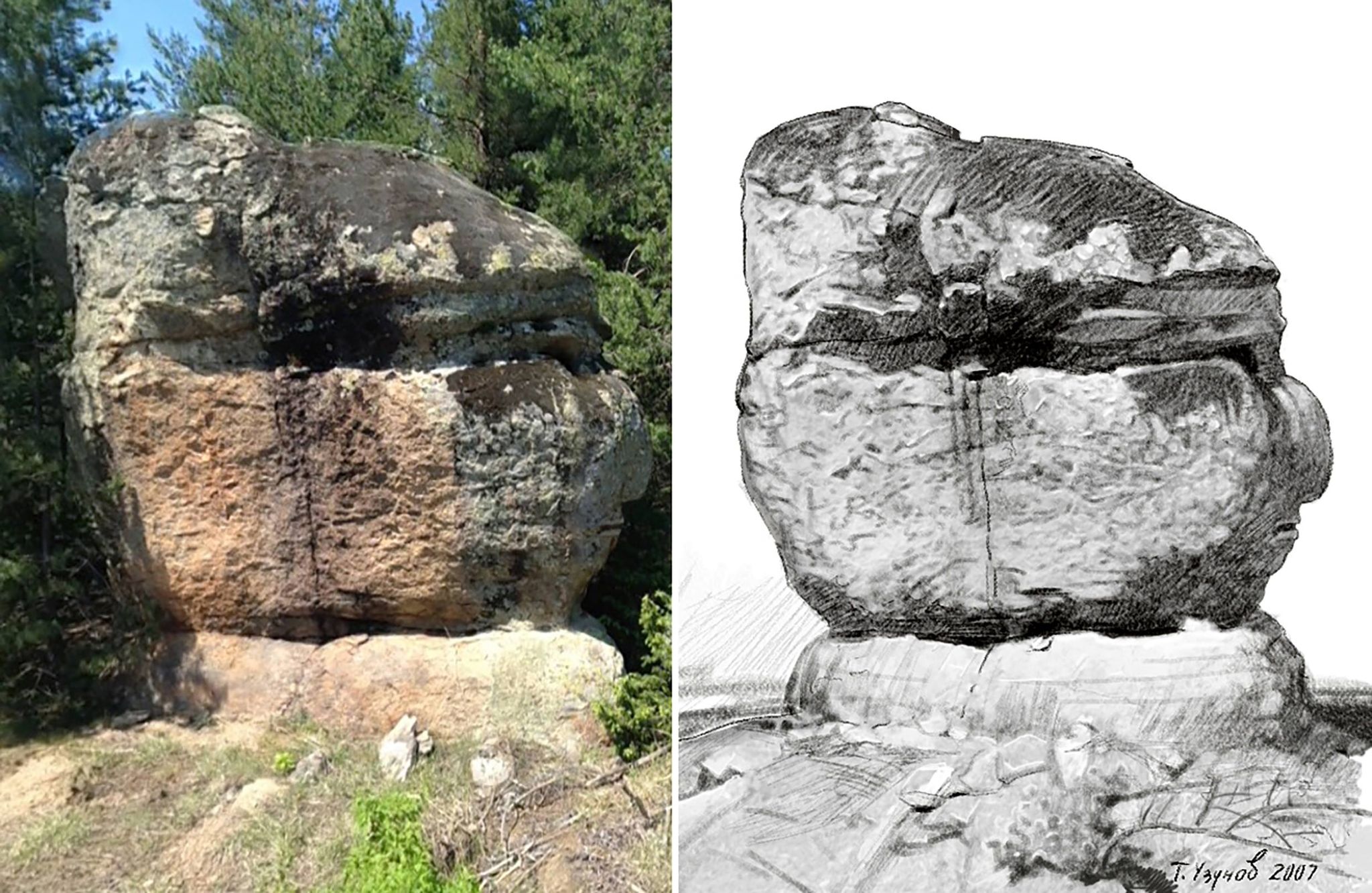 Хората от ранножелязната епоха са открили това място преди мен. В голямата си част по мое мнение то е природен феномен с малко човешка намеса. Това представлява входът на самото съоръжение от мегалитен тип. То има проход, ориентиран на изток, през който се излиза на естествена каменна площадка с кръгла форма, като само блоковете от южната й страна е възможно да са били преподреждани. Не така стои въпросът обаче със скалата от северния й край. Тя е огромен петметров обелиск от плоска скала, която е изправена с общи усилия и вкопана в терена с поне три метра добавена дължина. Ориентирана е също на изток като в профил са наподобени очи, уста, шия, която служи за постамент, а на главата с фригийски тип шапка, твърде популярна в тогавашна Тракия. Разбира се, тя не е велико проявление на пластична култура, но определено респектира с огромните усилия и вложен труд, нужни при обработването на подобен внушителен блок от гранит. Аз търсих това място. Бях чувал, че там някъде има скален обект, подобен на друг в м. Скрибина, между родното ми Сатовча и с. Крибул. Хората ги наричат профанно "промушкалки". Това беше през вече далечната 2007-ма година. В рамките на деня направих рисунка на мястото като все още не осъзнавах пред какво се намирам. Освен мястото за провиране, което съвсем не бе незначително, изправения камък от север видимо бе по-важният в цялата организация на обекта.С цел да го опазя публикувах кратко описания значително по-късно поради кошмарните условия, в които тогава се намираше държавата, а именно иманярските набези. Дори помолих публично да не се копае там, защото това е място за ритуали, а не трезор на скъпи вещи. Това не попречи още същата седмица да се извършат първите изкопи. Те обаче извадиха на повърхността керамика, която бе от ранножелязна епоха до късна античност, което определя времето, в което този обект е функционирал. Без особени очаквания подадох сигнал до ГДБОП тогава с цел да открият хората и да върнат един много интересен хромел, от който на терена беше останала едва една шеста и вероятно е бил използван при ритуали по приношения. Междувременно в обект на 200 м. под него в м. "Градище", Тодор Бояджиев при обход намира енеолитна керамика, което даде основание на пресата да напише, че става въпрос за праисторическа лечебница на 7000 години. Това бе безрезервно прието, защото хората и днес ползват тези обекти за лечение на различни по вид заболявания. Този обект обаче беше с прекъснати функции, неизвестен и непосещаван в един огромен период от време.