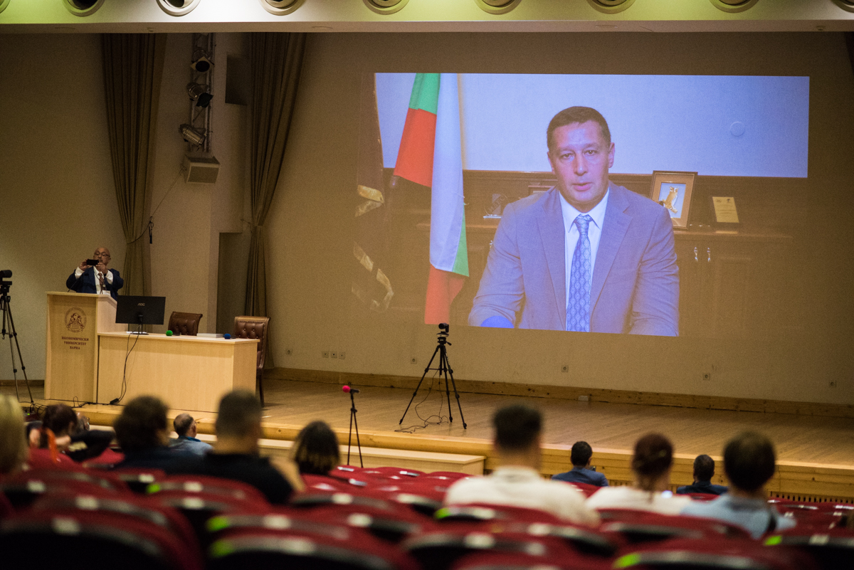 Приветствие към участници във форума отправи и ректорът на Икономически университет – Варна проф. д-р Евгени Станимиров. В него той постави въпроси, които имат дългосрочна проекция върху системата на висшето образование. Сред тях се открояват тези, свързани със стратегията за развитие на младите хора и дали тя ще позволи да ги подготвим адекватно за бъдещето при условие, че ние не знаем параметрите на това бъдеще. „Дигитализацията е друга тема, по която си струва да говорим, защото тя не се изчерпва само с използването на изкуствен интелект. Осигуряването на равен достъп до образование е друг проблем със стратегическо значение в системата на висшето образование.“ – подчерта проф. д-р Евгени Станимиров.