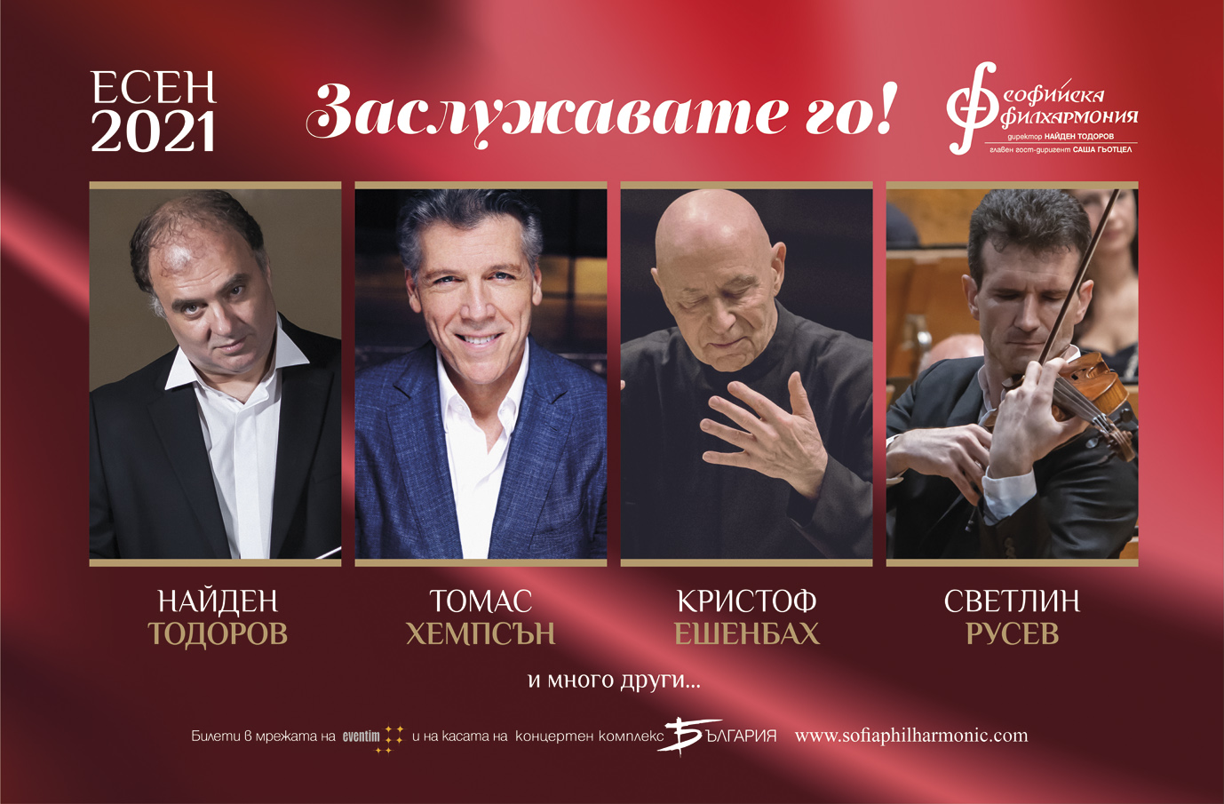Софийската филхармония пусна в продажба отделните концерти от сезон Есен 2021. До края на лятото те ще се продават със специални летни цени. Сред предложенията на националния оркестър са концерти със световноизвестните солисти Стивън Ковачевич, Валентина Лисица, Томас Хемпсън, Сергей Хачатрян, Анна Федорова, Вилде Франг, Александър Улман, Светлин Русев, както и колосите на диригентското изкуство Владимир Федосеев, Кристоф Ешенбах, Денис Ръсел Дейвис, Клаус Петер Флор, Емил Табаков, Алфред Ешве. Програмата на Филхармонията включва произведения от всички епохи - от Хайдн и Бах до Чайковски и Рахманинов. Не са пропуснати и любителите на филмовата музика, за които ще звучат емблематичните песни от филмовата поредица за Джеймс Бонд.