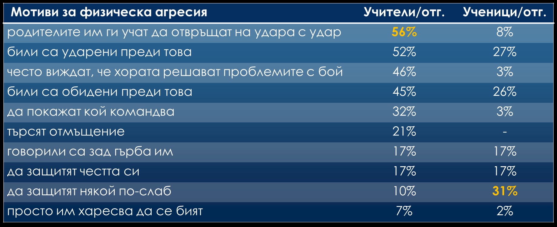 Интерес представлява липсата на единомислие между учители и ученици относно мотивацията за агресия на учениците. Например, резултатите показват, че най-често посочван мотив за проява на физическа агресия от страна на самите ученици е защита на по-слаб съученик, който е бил обект на агресия. Но според учителите, този мотив заема едно от последните места за физическата агресия на учениците. И докато учениците най-рядко посочват като мотив възпитателни практики на родителите им („да отвърнеш на удара с удар”), според учителите това е водеща причина за физическата агресия на учениците. Според учителите, мотивите, свързани с нормативния контекст и стремежа към доминиране чрез агресия, също са водещи, докато учениците рядко ги припознават като причини за проява на физическа агресия. Именно очертаните различия в мненията на учители и ученици открояват полетата, на които се обръща специално внимание при разработване на Програмата.