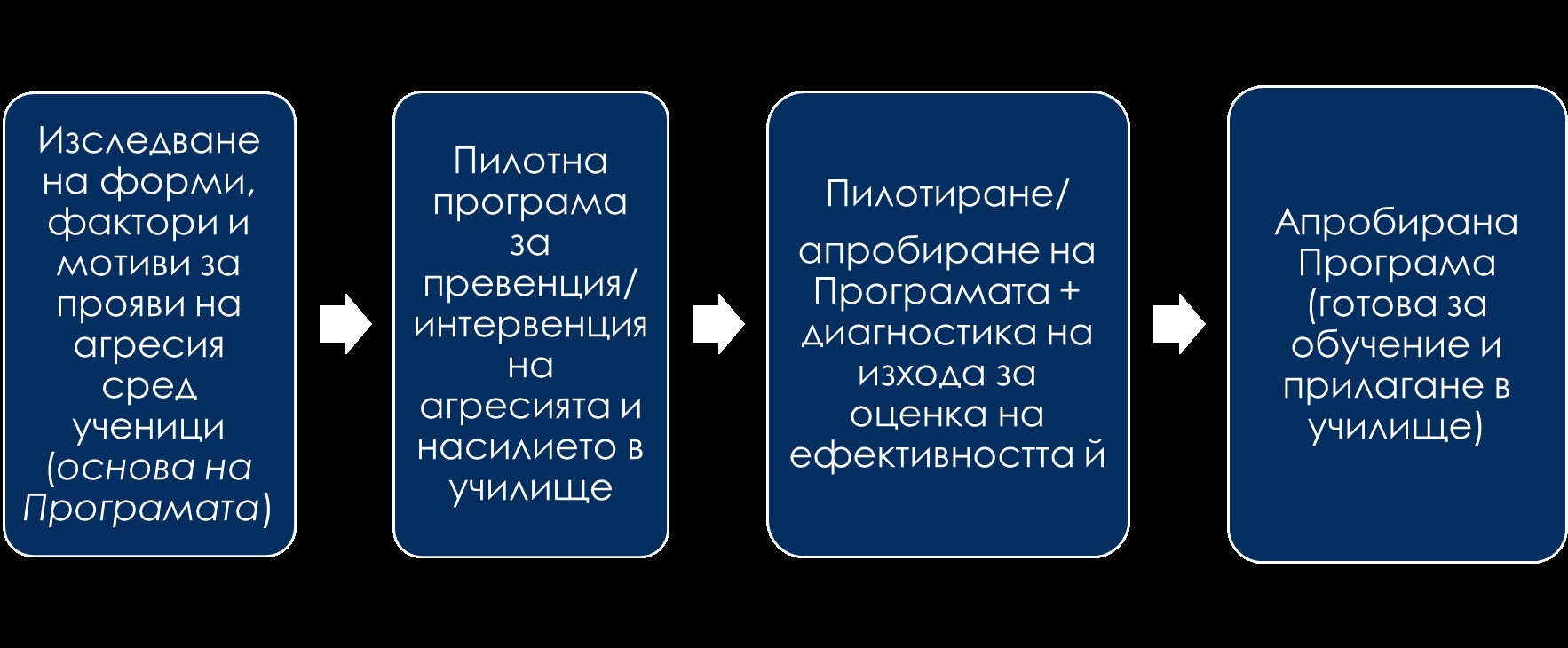Програмата за превенция и интервенция на агресията и насилието в училище се основава на резултатите от изследване на формите, факторите и мотивите за проява на агресия сред ученици. Изследването е подготвено и проведено от научен колектив от Департамент „Психология”, ИИНЧ-БАН, през периода октомври 2017 – февруари 2018 година в 18 основни, средни и професионални училища/гимназии в различни по големина градове в страната (София, Бургас, Велико Търново, Хасково, Мездра, Раднево). Включени са 992 ученици от IV, VI, VIII и X клас, както и 115 учители. Очертани са основни тенденции при проявите на агресия в училище от гледна точка и на учениците, и на учителите.