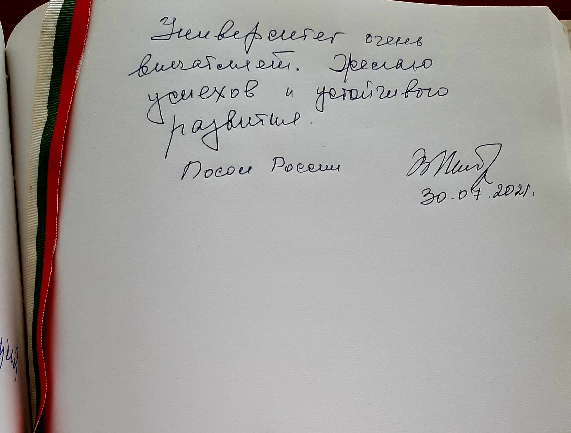 „Университетът много ме впечатли. Желая успехи и устойчиво развитие“, написа Н.Пр. Елеонора Митрофанова в почетната книга на ВСУ „Черноризец Храбър“.