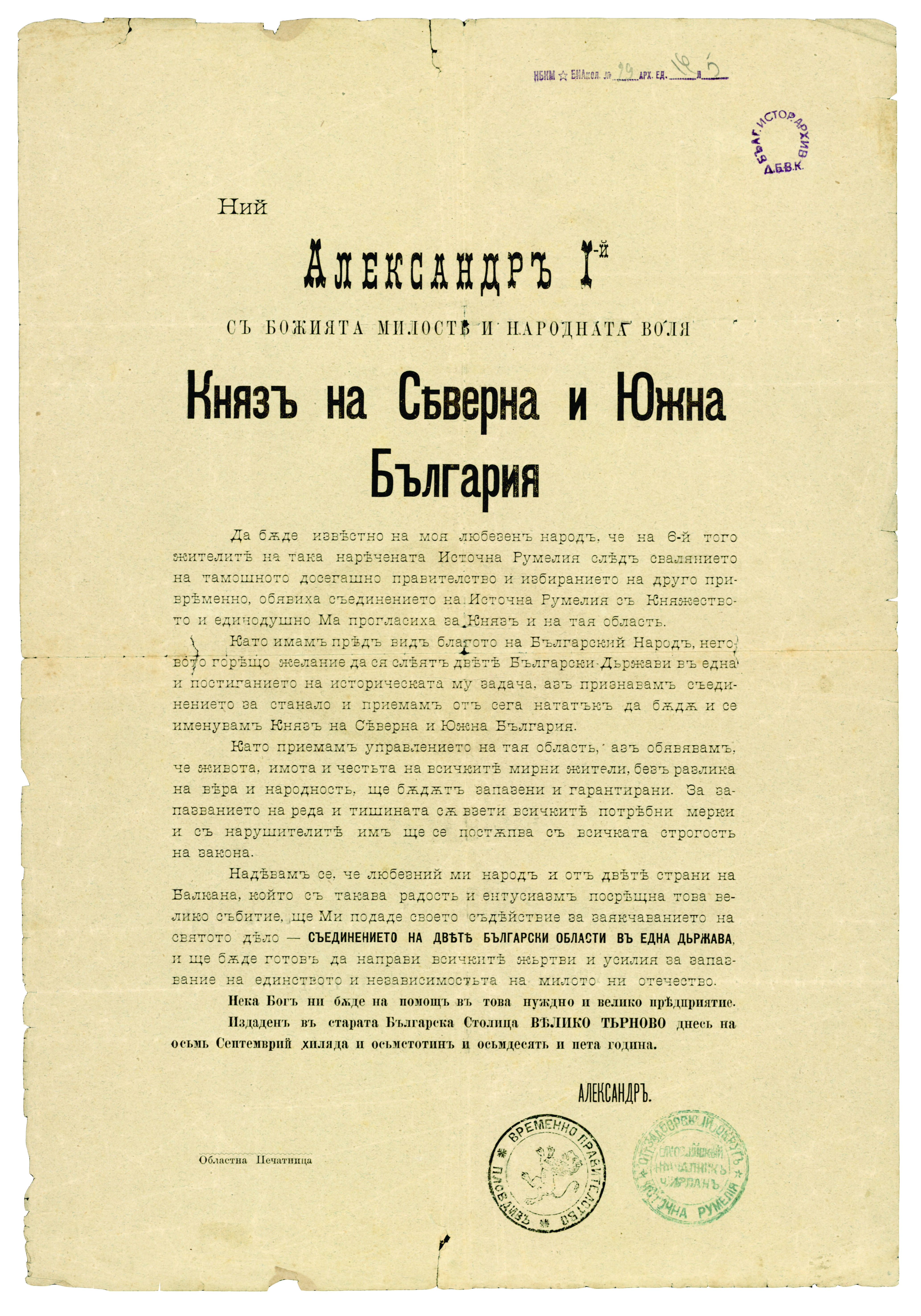 Манифест от княз Александър I Батенберг до българския народ за Съединението на Източна Румелия с Княжество България, Велико Търново, 8 септември 1885 г.