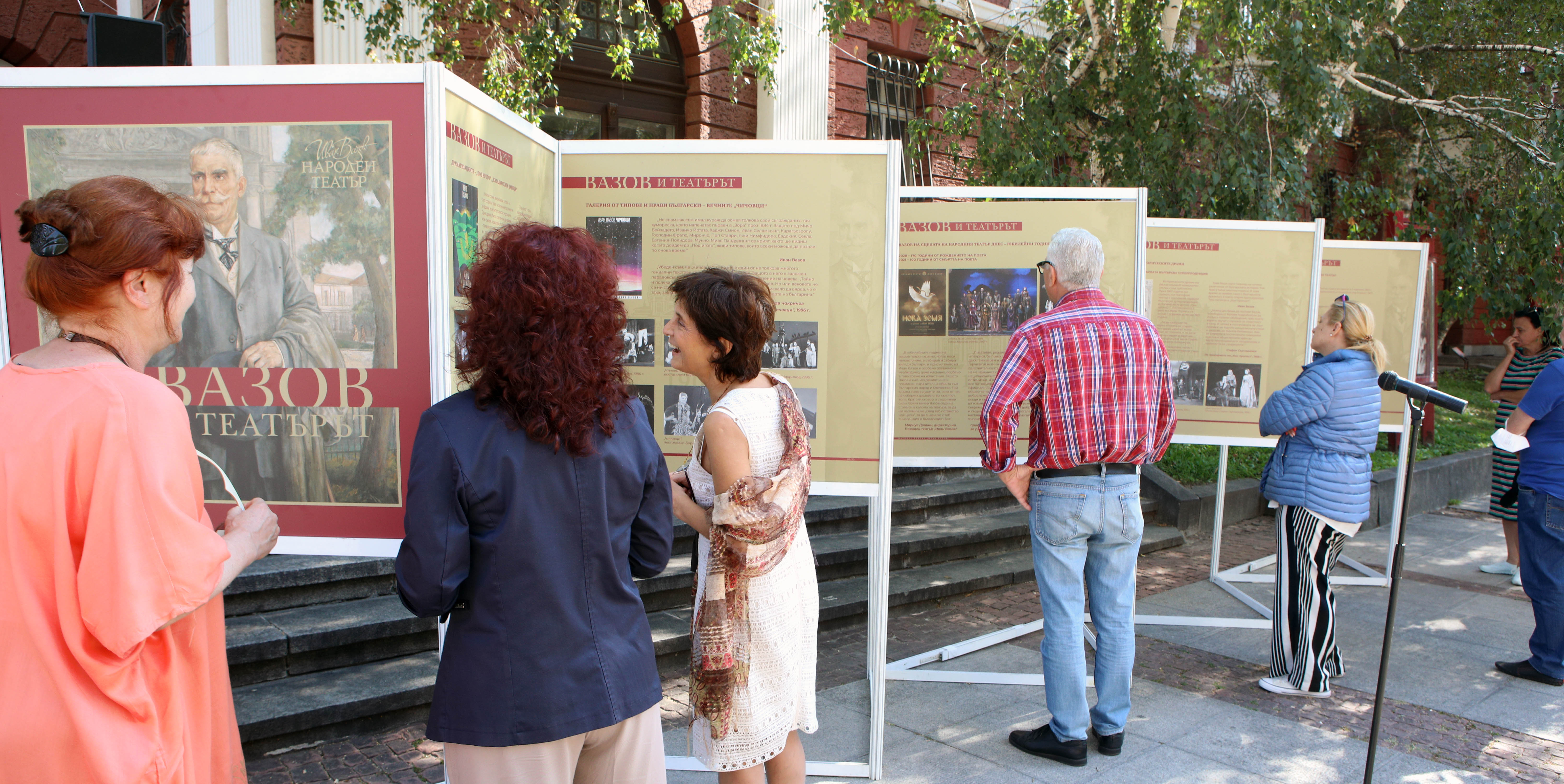 Днес, 100 години след смъртта на Вазов, си припомняме в снимки и документи незаменимия му принос за развитието на българския национален театър. В изложбата „Вазов и театърът“ е включен летопис на всички представления по Вазови творби, поставени през годините. Специални акценти в снимки, отзиви и документи има върху „Хъшове“, „Към пропаст“, „Борислав“, превърнали се в същински театрални митове. Отделено е място и на вечните Вазови комедии – „Службогонци“ и „Двубой“, на драматизациите на „Под игото“, „Чичовци“, „Казаларската царица“. Последните две юбилейни Вазови години също присъстват с най-новите прочити на Вазов в Народния театър.