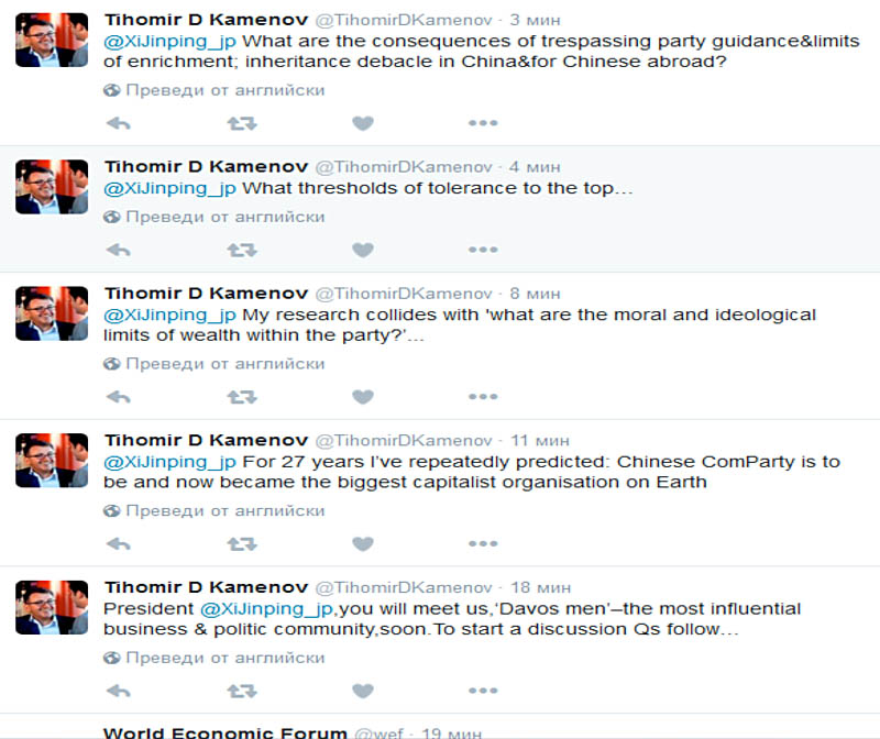 Ето въпросите на Тихомир Каменов към Си Цзипин: „Президент Си, Вие скоро ще се срещнете с нас, членовете на Давос – най-влиятелната икономическа и политическа общност. В продължение на 27 години многократно съм предсказвал, че Китайската комунистическа партия ще стане, и вече реално е, най-голямата капиталистическа организация в света. Проучванeто ми включва въпроси като: „какви са моралните и идеологически граници на обогатяването в партията? Какви са праговете на толерантността към върхушката? Какви са последиците от прекрачването на партийните директиви и границите на обогатяване? Неяснотите относно правото на наследяване в Китай и китайците в чужбина.”