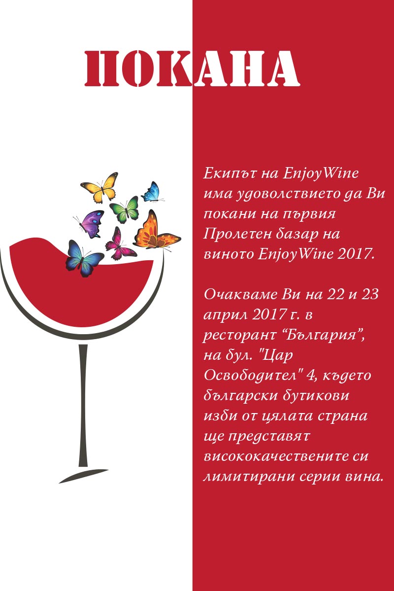 В отговор на тази потребност изби от цялата страна ще представят пред жителите и гостите на София новото лице на българското винопроизводство. Събитието ще се проведе на 22 и 23 април в залите на ресторант "България", на бул. "Цар Освободител" 4. За посетителите е предвидена интересна съпътстваща програма с музика на живо, тематични дегустации, кратки обучения, конкурс за най-атрактивен щанд и други изненади.