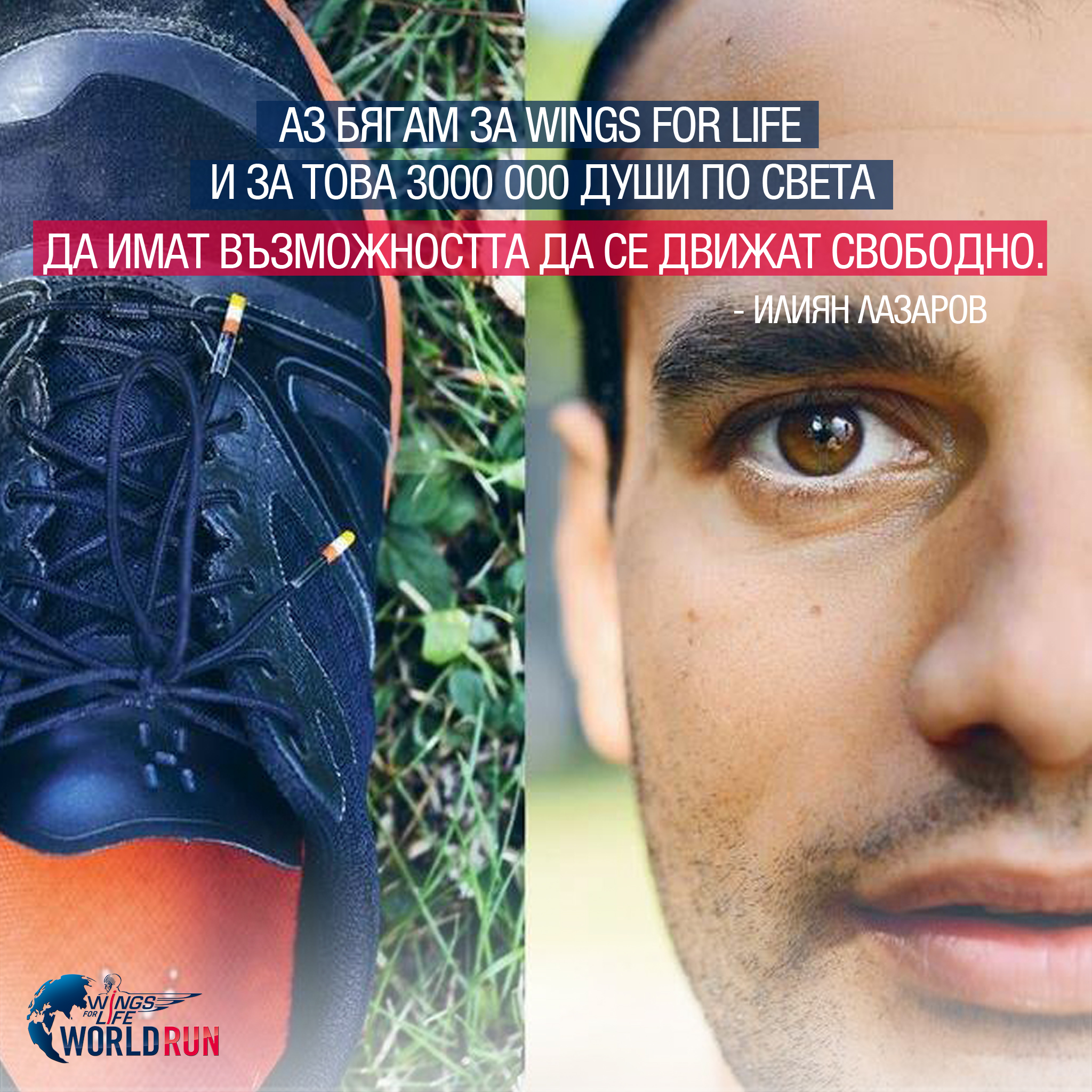 Илиян Лазаров Run BG: Защото каузата на Wings for Life има потенциала да променя десетки хиляди човешки съдби и да помага на хора, страдащи от гръбначни увреждания. Всички средства събрани от бягането отиват 100 процента за медицински проучвания, целящи гръбначните увреждания да станат напълно лечими.
