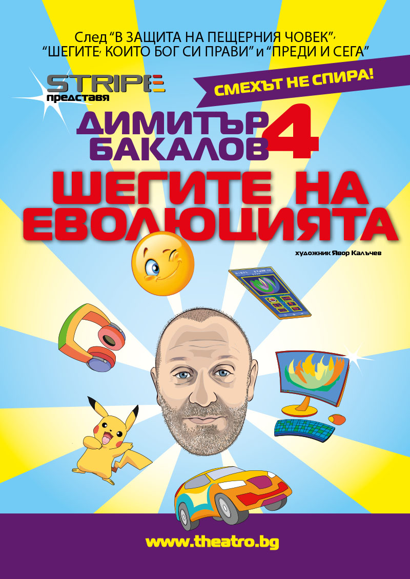 “Шегите на еволюцията” е четвъртият от поредицата моноспектакли на Димитър Бакалов и третият му изцяло авторски проект. Актьорът и мениджър на арт пространството ТЕАТРО, а вече и приятел на публиката Митко, този път ни показва живота от научната му страна през теорията на Чарлз Дарвин. Ще бъдете изумени колко много от съвременните устройства си правят шеги с нас. Мобилни телефони, компютри, автомобили, електроуреди – за срещите ни и забавните ни противоречия с тях – знаете, че можете да се доверите на Димитър Бакалов да ви накара да се заливате от смях.