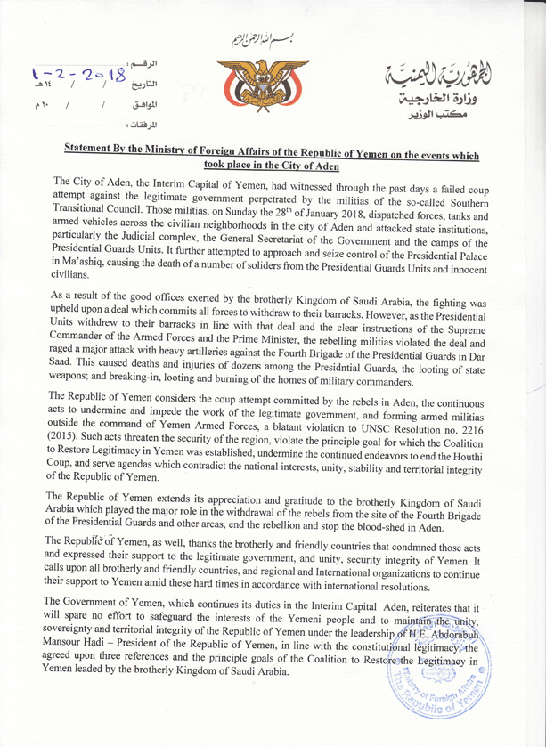 The Republic of Yemen considers the coup attempt committed by the rebels in Aden, the continuous acts to undermine and impede the work of the legitimate government, and forming armed militias outside the command of Yemen Armed Forces, a blatant violation to UNSC Resolution no. 2216 (2015). Such acts threaten the security of the region, violate the principle goal for which the Coalition to Restore Legitimacy in Yemen was established, undermine the continued endeavors to end the Houthi Coup, and serve agendas which contradict the national interests, unity, stability and territorial integrity of the Republic of Yemen.